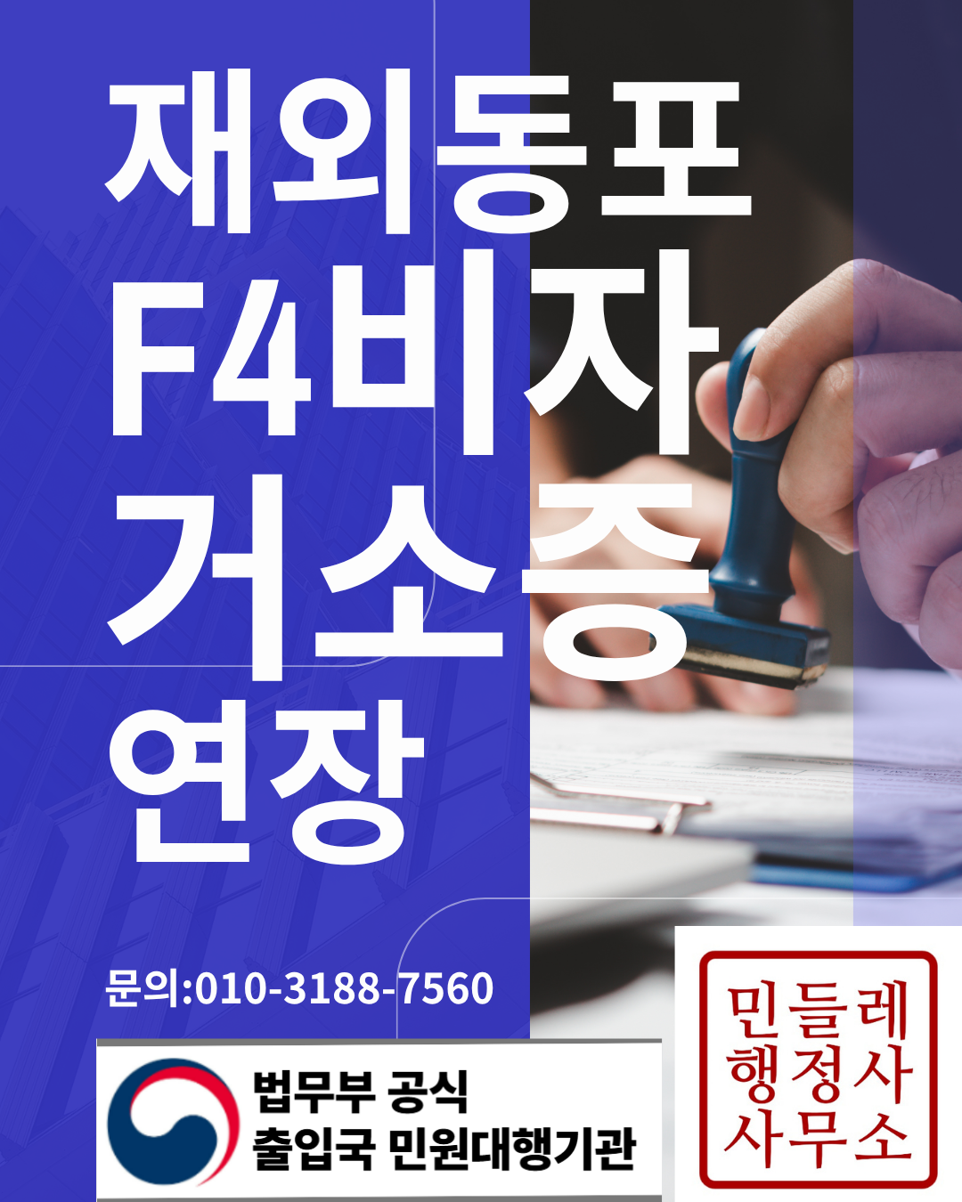 민들레행정사사무소는 재외동포 비자, 거소증, 국적 관련 업무를 전문적으로 대행해 온 풍부한 경험을 보유하고 있습니다. 특히 F4 비자 연장, 체류지 변경, 직업신고와 같은 복합 업무는 단순 행정처리가 아닌 숙련된 절차 대응이 필요합니다. 서울과 경기 지역을 중심으로 전국 비대면 급행 처리가 가능하며, 의뢰인의 일정과 상황에 맞춘 신속한 대응을 약속드립니다. “혼자 준비하면 며칠이 걸릴 일, 민들레행정사는 하루 만에 끝냅니다.” 급한 일정, 불안한 상황일수록 전문 행정사의 도움이 필수입니다.